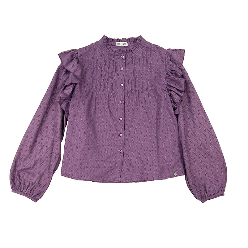 Blusa de color berenjena con botones en el frontal y volantes en los hombros. Forro en el cuerpo y goma elástica en puños. Tejido fantasía bordados